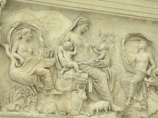 Der Altar “Ara Pacis” ist Pax gewidmet, einer Göttin, die in der augusteischen Politik verehrt wurde und deren Universalität, garantiert durch die Figur des Kaisers, der Altar verherrlicht, wie die Verwendung des Adjektivs Augusta andeutet: Das Dekret, das den Bau der Ara genehmigte, wurde 13 v. Chr. ratifiziert; der historische Anlass war Augustus’ Rückkehr von jenseits der Alpen, nachdem er drei lange Jahre fernab von Rom in zwei für die Sicherheit und den Wohlstand des Reiches entscheidend wichtigen Regionen als Administrator tätig gewesen war.