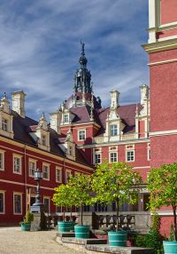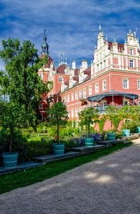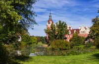 1815 legte Fürst Pückler-Muskau seinen wunderschönen Landschaftspark in der Oberlausitz an. Ein drittel des 830 Hektar großen Parks mit dem Neuen Schloss befindet sich in der Stadt Bad Muskau. Der größere Teil der Parkanlage befindet sich östlich der Neiße und nördlich der Stadt Leknica auf polnischer Seite.