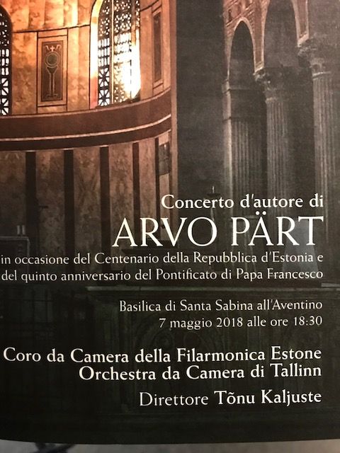 Im Jahr 2018 feiert Estland seinen 100. Geburtstag. Es gibt viele Veranstaltungen in Estland, die an die Geschichte des Landes erinnern. Der Geburtstag wurde auch in Rom in der Basilika Santa Sabina all’Aventino, eine römisch-katholische Kirche die auf dem Aventin-Hügel liegt, mit dem Komponist Arvo Pärt und unter Anwesenheit von diplomatische Vertreter und des estnischen Dirigenten Tõnu Kaljuste gefeiert. Cantus in memoriam Benjamin Britten (1977, rev. 1980) für Streichorchester und Glocke eröffnete das Programm des Abends mit Tallinna Filharmoonia.