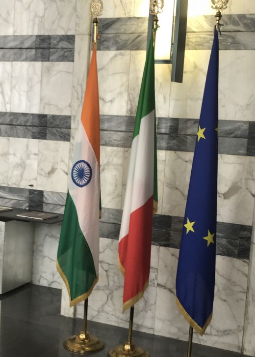 Der italienische Außenminister Enzo Moavero Milanesi und der indische Außenminister Sushma Swaraj heute am 18. Juni 2018 in Rom. Nach einer langen Periode von internationalen Kontroversen: zwei italienische Soldaten erschießen zwei indische Fischer und die indische Polizei im 2013 die zwei  Seeleute verhaftete. Heute verbreiteten sich gute Beziehungen zwischen den beiden Ländern einer sehr alten Kultur.