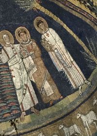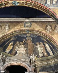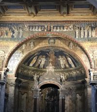 Die Kirche S. Prassede in Rom birgt die beachtenswerteste Gruppe römischer Mosaiken des 9. Jh. Die Kirche des 5 Jh. Ist der hl. Praxedis geweiht. Über dem Triumphbogen ist das Himmliche Jerusalem dargestellt, dessen Mauern und edelsteinglänzende Tore Erzengel beschützen. In einer Nische ein 1223 beim Kreuzzeug Kaiser Friedrich II. von Kardinal Colonna nach Rom gebrachtes Säulenfragment, das von der Geiβelsäule Christi stammen soll.